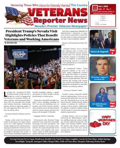 1Serving Veterans In Las Vegas, Henderson, Boulder City, North Las Vegas, Laughlin, Creech Air Force Base, Indian Springs,Searchlight, Tonopah, Amargosa Valley, Moapa Valley, Nellis Air Force Base, Mesquite, Pahrump, Beatty, Reno.Nevada%u2019s Premier Veterans Newspaper!VETERANSReporter NewsFeb 1, 2025VOL. 27 No. 3Visit our mobile friendly website atveteransreporternews.comHonoring Those Who Have So Bravely Served This CountryALA 2025 Mission TrainingVance & HegsethHonoring a Legacy Lt Col Brian ElliPage6&7Page3Page5LOCALPOSTAL CUSTOMERPRSRT STDECRWSSU.S. POSTAGEPAIDEDDM RETAILPresident Trump%u2019s Nevada Visit Highlights Policies That Benefi t Veterans and Working Americans%u25a0 MILITER.COMLas Vegas, NV %u2013 On January 24, 2025, President Donald Trump arrived in Nevada for a series of engagements that focused on economic reforms, disaster response, and international diplomacy. His visit resonated with veterans and working Americans, underscoring policies aimed at improving quality of life and supporting those who serve or have served the nation.Economic Relief for Workers and VeteransDuring a rally at the Circa Resort & Casino in downtown Las Vegas, attended by over 1,000 supporters, President Trump emphasized his administration%u2019s ongoing commitment to American workers. One policy announcement stood out: his pledge to eliminate taxes on tips%u2014a move directly benefi ting employees in Nevada%u2019s hospitality industry, a signifi -cant portion of which includes veterans transitioning to civilian careers.Trump also reiterated his broader economic vision, including extending the 2017 tax cuts and abolishing taxes on overtime and Social Security benefi ts. These initiatives aim to provide fi nancial relief for retired veterans and those balancing work alongside VA benefi ts.Engaging with the CommunityFollowing his rally, President Trump toured the Circa casino fl oor, personally interacting with staff and patrons. His outreach included a conversation with a waitress who expressed gratitude for his tax policies and mingling with casino visitors, many of whom showed appreciation with chants of %u201cUSA! USA!%u201dSuch direct engagement highlights his administration%u2019s connection to grassroots concerns, particularly in states like Nevada, home to a large veteran population and a robust hospitality industry.Disaster and International Policy RemarksPresident Trump%u2019s visit to Nevada also followed stops in North Carolina and California to assess disasterstricken areas. For veterans involved in disaster response or rebuilding efforts, his emphasis on providing aid and fostering recovery is a reminder of the administration%u2019s commitment to national resilience.On international matters, Trump proposed solutions to the crisis in Gaza, urging neighboring countries like Egypt and Jordan to accommodate Palestinians. While primarily focused on foreign diplomacy, these discussions may resonate with veterans who served in the Middle East, highlighting his commitment to innovative solutions for enduring confl icts.A Focus on Veterans%u2019 NeedsNevada%u2019s veteran community benefi ts from the administration%u2019s focus on economic growth and disaster recovery. Policies like eliminating taxes on tips and Social Security benefi ts directly impact veterans re-entering the workforce or relying on fi xed incomes. Additionally, his emphasis on disaster readiness aligns with the needs of veteran-led emergency response organizations.President Trump%u2019s visit to Las Vegas showcased his administration%u2019s priorities: uplifting American workers, including veterans, addressing domestic challenges, and fostering stability abroad. His policies and outreach continue to resonate with those who have served, ensuring they remain integral to the nation%u2019s progress.