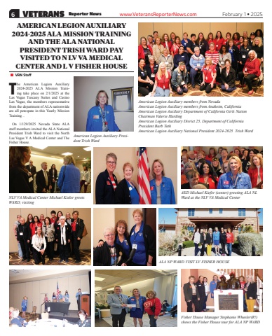 6 VETERANS Reporter News www.VeteransReporterNews.com February 1 %u2022 2025AMERICAN LEGION AUXILIARY 2024-2025 ALA MISSION TRAINING AND THE ALA NATIONAL PRESIDENT TRISH WARD PAY VISITED TO N LV VA MEDICAL CENTER AND L V FISHER HOUSE%u25a0 VRN StaffThe American Legion Auxiliary 2024-2025 ALA Mission Training take place on 2/1/2025 at the Las Vegas Tuscany Suites and Casino Las Vegas, the members representative from the department of ALA nationwide are all petespate in this Yearly Mission Training ..On 1/129/2025 Nevada State ALA staff members invited the ALA National President Trish Ward to visit the North Las Vegas V A Medical Center and The Fisher House.American Legion Auxiliary members from NevadaAmerican Legion Auxiliary members from Anaheim, CaliforniaAmerican Legion Auxilairy Department of California Girls NationChairman Valerie HardingAmerican Legion Auxiliary Disrict 25, Department of CaliforniaPresident Barb TothAmerican Legion Auxiliary National President 2024-2025 Trish WardAmerican Legion Auxiliary President Trish Ward AED Michael Kiefer (center) greeting ALA NL NLV VA Medical Center Michael Kieler greets Ward at the NLV VA Medical Center WARD, visiting ALA NP WARD VISIT LV FISHER HOUSE Fisher House Manager Stephanie Wheeler(R!) shows the Fisher House tour for ALA NP WARD