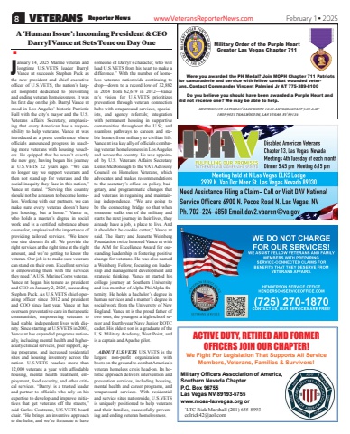 8 VETERANS Reporter News www.VeteransReporterNews.com February 1 %u2022 2025A %u2018Human Issue%u2019: Incoming President & CEO Darryl Vance nt Sets Tone on Day One%u25a0January 14, 2025 Marine veteran and longtime U.S.VETS leader Darryl Vance nt succeeds Stephen Peck as the new president and chief executive offi cer of U.S.VETS, the nation%u2019s largest nonprofi t dedicated to preventing and ending veteran homelessness. It was his fi rst day on the job. Darryl Vance nt stood in Los Angeles%u2019 historic Patriotic Hall with the city%u2019s mayor and the U.S. Veterans Affairs Secretary, emphasizing that every American has a responsibility to help veterans. Vance nt was introduced at a press conference where offi cials announced progress in reaching more veterans with housing vouchers. He quipped that he wasn%u2019t exactly the new guy, having begun his journey at U.S.VETS 22 years ago. %u201cWe can no longer say we support veterans and then not stand up for veterans and the social inequity they face in this nation,%u201d Vance nt stated. %u201cServing this country should not be a reason to become homeless. Working with our partners, we can make sure every veteran doesn%u2019t have just housing, but a home.%u201d Vance nt, who holds a master%u2019s degree in social work and is a certifi ed substance abuse counselor, emphasized the importance of providing tailored services. %u201cWe know one size doesn%u2019t fi t all. We provide the right services at the right time at the right amount, and we%u2019re getting to know the veteran. Our job is to make sure veterans can stand on their own. Excellent service is empowering them with the services they need.%u201dA U.S. Marine Corps veteran, Vance nt began his tenure as president and CEO on January 2, 2025, succeeding Stephen Peck. As U.S.VETS chief operating offi cer since 2012 and president and COO since last year, Vance nt has overseen preventative care in therapeutic communities, empowering veterans to lead stable, independent lives with dignity. Since starting at U.S.VETS in 2003, Vance nt has expanded programs nationally, including mental health and higheracuity clinical services, peer support, aging programs, and increased residential sites and housing inventory across the nation. U.S.VETS reaches more than 12,000 veterans a year with affordable housing, mental health treatment, employment, food security, and other critical services. %u201cDarryl is a trusted leader and partner to offi cials who rely on his expertise to develop and improve initiatives that get veterans off the streets,%u201d said Carlos Contreras, U.S.VETS board chair. %u201cHe brings an inventive approach to the helm, and we%u2019re fortunate to have someone of Darryl%u2019s character, who will lead U.S.VETS from his heart to make a difference.%u201d With the number of homeless veterans nationwide continuing to drop%u2014down to a record low of 32,882 in 2024 from 62,619 in 2012%u2014Vance nt%u2019s vision for U.S.VETS prioritizes prevention through veteran connection hubs with wraparound services, specialists, and agency referrals; integration with permanent housing in supportive communities throughout the U.S.; and seamless pathways to careers and stable homes from military to civilian life. Vance nt is a key ally of offi cials combating veteran homelessness in Los Angeles and across the country. He was appointed by U.S. Veterans Affairs Secretary Denis McDonough to the VA%u2019s Advisory Council on Homeless Veterans, which advocates and makes recommendations to the secretary%u2019s offi ce on policy, budgetary, and programmatic changes that aid veterans in regaining and maintaining independence. %u201cWe are going to be the connecting bridge so that when someone walks out of the military and starts the next journey in their lives, they already have a job, a place to live. And it shouldn%u2019t be cookie cutter,%u201d Vance nt said. The Harry and Jeanette Weinberg Foundation twice honored Vance nt with the AIM for Excellence Award for outstanding leadership in fostering positive change for veterans. He was also named a Weinberg Fellow, focusing on leadership and management development and strategic thinking. Vance nt started his college journey at Southern University and is a member of Alpha Phi Alpha fraternity. He holds a bachelor%u2019s degree in human services and a master%u2019s degree in social work from the University of New England. Vance nt is the proud father of two sons, the youngest a high school senior and fourth-year Navy Junior ROTC cadet. His eldest son is a graduate of the U.S. Military Academy, West Point, and is a captain and Apache pilot.ABOUT U.S.VETS U.S.VETS is the largest non-profi t organization with boots on the ground to combat America%u2019s veteran homeless crisis head-on. Its holistic approach delivers intervention and prevention services, including housing, mental health and career programs, and wraparound services. With residential and service sites nationwide, U.S.VETS is uniquely positioned to help veterans and their families, successfully preventing and ending veteran homelessness.4 VETERANS Reporter News www.VeteransReporterNews.com March 15 %u2022 2022ACTIVE DUTY, RETIRED AND FORMER OFFICERS JOIN OUR CHAPTER!We Fight For Legislation That Supports All Service Members, Veterans, Families & Survivors!Military Officers Association of America,Southern Nevada ChapterP.O. Box 96755Las Vegas NV 89193-5755www.moaa-lasvegas.org orLTC Tommy Thompson(702) 914-1844INVITATIONJewish War Veterans of the USASgt. Manny Peven Post 65Henderson, NV 89044Meets the First Sundayof Every MonthFor further information contact:JERRY(702) 565-1430PresentsPERSONAL PLANNINGand SURVIVING SPOUSESYMPOSIUMMonday, May 16, 2022Clark County Library Theater1401 E. Flamingo Rd, Las Vegas5:15 pm registration6:00 pm program7:30 pm refreshmentsFree AdmissionScan QR code to pre-registerPre-registration requestedFor additional information: www.MOAALasVegas.orgOR (702) 496-5134 
