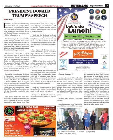 February 1 %u2022 2025 www.VeteransReporterNews.com VETERANS Reporter News 9PRESIDENT DONALD TRUMP%u2019S SPEECH%u25a0 Col KeirnI will have to admit that I had many concerns about our country%u2019s future and Donald Trump becoming President. Now after listening to his speech those feelings are much better. It was well done and there are many things that I did like to hear during it. The Golden Age of America will be greater, stronger, and far more exceptionally was to me a strong point that was made. The one thing that I did like the most was to hear a leader of our country deliver the truth of a dark and brooding denunciation of our government.The Executive Orders that he signed and there were many of them but only a few stood out for me. The Declaration of an Emergency on our Southern Border was right on and long overdue. The renaming of the Gulf of Mexico to the Gulf of America I did not like. Who owns it? And can we really do that? Was it even necessary? All this will be answered sooner than later.He said he was ending the Birthright of Citizenship. I am not so sure about this. He has taken an oath to preserve, protect, and defend the Constitution of the United States. Now he suggest throwing out Article XIV Section 1 that says all people born or naturalized in the United States are Citizens of the United States. I feel that he may be violating not only the Constitution but also his oath. We shall see.Then there is the fact that when Donald Trump was taking his oath that he did not place his hand on the bible and that can or will be taken several ways. Then there was Elon Musk who is being accused of giving a Nazi hand salute. I did not see that, I did see him raise his arm and hand, but a Nazi hand salute give me a break on this one.I think the that declaring the Drug Cartels a terrorist organization is a good thing because it will open more options for us. And the declaration of war on America%u2019s street gangs was nice to hear. Now maybe we will do something about them.On a lighter side I think that Mrs. Trump should have gotten rid of that stupid hat then she would not have to keep holding it on. Then who am I to say anyway.I did like to hear of the pardons of the military personnel who were discharged for not taking their shots with full back pay. That made me happy.With the infl ated cost of items and his plan to lower the prices that will remain to be seen. Those costs are tied to wages which will be a separate issue. The cut back of the government%u2019s civil service may not be as easy as he would like. There are laws in place and unions he must deal with. Good luck there.Overall, his speech was sort of uplifting and as for making America Great Again we will have to wait and see.Best part was President Biden departing on Marine One and he did not trip getting in.service delivery, the VA is relocating some specialty services to communitybased locations, increasing onsite offerings, and implementing a master plan to optimize patient care. The VA currently operates seven clinics in Las Vegas and Henderson, as well as additional facilities in Laughlin and Pahrump, providing accessible care and support to local veterans.Mobility and Adaptive Equipment ServicesA vital component of the VA%u2019s healthcare offerings is its mobility and adaptive equipment services. The VA ensures that veterans in need receive properly fi tted manual and powered wheelchairs, with evaluations conducted by a dedicated team from the NLV VA Medical Center to determine the best solutions based on medical requirements. As the veteran population in Southern Nevada continues to grow, the NLV VA Medical Center remains steadfast in its commitment to expanding services and enhancing accessibility. With a robust framework for development, local veterans can expect improved access to healthcare, fi nancial support, and essential resources, ensuring they receive the care and recognition they deserve for years to come.Continue from page 2NLV VA Medical Center A.E.D Michael Kiefer greeting ALA NP Trish Ward %u2018s visit