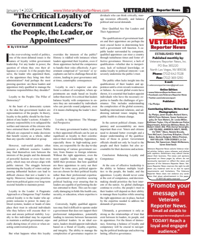 January 1 %u2022 2025 www.VeteransReporterNews.com VETERANS Reporter News 3VETERANSReporter NewsESTABLISHED 1989Published monthly by:Veterans Reporter News, Inc.PO Box 365220North Las Vegas, NV 89036Phone: (702) 642-7028 Fax: (702) 369-1290E-mail:%u2022 veteransreporternews@gmail.comOnline Edition:%u2022 www.VeteransReporterNews.com%u2022 Facebook.com/Veterans-Reporter-News%u2022 Twitter.com/veteransreportPublisher: %u2022 Su PhelpsVeterans Reporter News solicits Veteran related articles, letters, press releases, and photos with captions. Advertisers may submit stories about their business. The views and opinions expressed on these pages by others do not necessarily represent or reflect the views and opinions of the Veterans Reporter News. Veterans Reporter News reserves the right to edit down any material sent to us due to space requirements and limitations. The Veterans Reporter News does not endorse any candidates that place advertisement in the paper.%u00a9 2017 All rights reserved.Contributing Editors, Writers And Photographers:Su Phelps, Janet Snyder, Richard Keirn, NDVS Press Release, Susan Santarcangelo, Dr Tom Waters, Dr. Linda MIller, Kathleen Taylor, City of Henderson Police Department, American Military News, Dr. Robert Odell .Md. PhD, Darryl Ginwright, LEN YELINEK, AMERICA NAVY, SNHD, Vic%u201dDOC%u201d Moss, Natalie Bruzda,Tom McCourt, Courtney B Kaplan, Chuck Baker, Barbra Rodgick, Nikkie Preston, RAY KELLER. TOM DORSEY, Lt Col Ranson, Pat Spearman, Ralph McNamara, karen Esterbook.%u201cThe Critical Loyalty of Government Leaders: To the People, the Leader, or Appointees?%u201d%u25a0 By V R N StaffIn the ever-evolving world of politics, one of the most debated issues is the nature of loyalty within government leadership. For any leader in power, the question of whom they owe their allegiance is crucial. Is it the people they serve, the leader who appointed them, or the appointees they bring into their administration? And perhaps the most pressing question: are these leaders and appointees truly qualified to manage the immense responsibilities they shoulder?Loyalty to the People: The Pillar of Democracy?At the heart of a democratic system is the idea that government leaders are representatives of the people. In theory, loyalty to the public should be the foundation of any leader%u2019s actions. A leader%u2019s primary responsibility is to safeguard the welfare and interests of the citizens who have entrusted them with power. Public officials are expected to make decisions that benefit society as a whole, rather than any specific individual or group.However, real-world politics often presents a different scenario. Leaders may find themselves torn between the interests of the people and the demands of powerful factions or even their own party, which may not always align with public interest. The struggle between maintaining the loyalty of voters and appeasing influential backers can lead to difficult choices that test a leader%u2019s integrity. Moreover, leaders may prioritize short-term political gains over long-term societal benefits to maintain power.Loyalty to the Leader: A Pragmatic Approach or a Dangerous Trap? Another critical loyalty is to the leader who appoints someone to power. In many political systems, leaders or heads of state place their trust in selected individuals who they believe will execute their vision and ensure political stability. Loyalty to this individual may be expected to maintain a unified government, especially during times of crisis or when enacting controversial policies.But what happens when this loyalty overrides the interests of the public? History is riddled with instances where leaders appointed their loyalists, even if those appointees lacked the competence to handle their roles effectively. A government comprised of %u201cyes-men%u201d or sycophants can fail to challenge flawed decisions, leading to poor governance and, at times, catastrophic consequences.Loyalty to one%u2019s superior can also foster a culture of corruption, where appointments are made based on loyalty rather than merit. It is critical that leaders balance loyalty with competence to ensure they are surrounded by individuals who can provide sound judgment, even if it means challenging the leader%u2019s decisions.Loyalty to Appointees: The Managerial PerspectiveFor many government leaders, loyalty to their appointed officials can be just as significant as loyalty to their constituents or their own leadership. Appointees, especially those in high-ranking positions, are responsible for the day-to-day functioning of various government sectors, from finance to foreign relations. Without the right appointees, even the most capable leader may struggle to fulfill their promises. But how qualified are these appointees to carry out their duties? In some cases, political appointees are chosen for their political loyalty rather than their professional expertise. A government may prioritize securing political backing over ensuring that its leaders are capable of performing the duties entrusted to them. This can be especially damaging in fields like health care, security, or education, where expertise is critical.Conversely, highly qualified appointees may find it difficult to operate under a government that does not support their professional independence, potentially leading to tensions between bureaucrats and political leaders. In an ideal scenario, leaders should appoint individuals based on a blend of loyalty, expertise, and integrity. The ability to manage the complexities of governance requires individuals who can think critically, manage resources efficiently, and balance political and social demands.How Qualified Are Our Leaders and Their Appointees?The qualifications of government leaders and their appointees are perhaps the most crucial factor in determining how well a government will function. A capable leader surrounded by competent, qualified appointees can steer a count