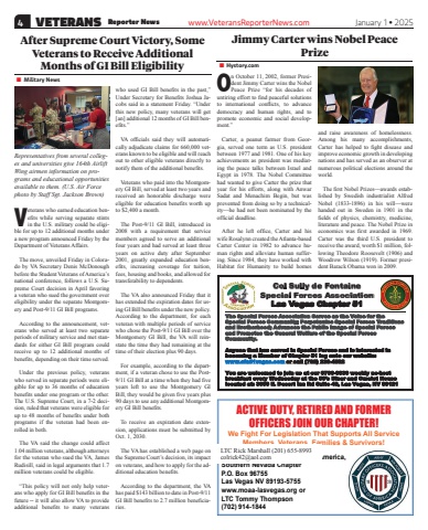 4 VETERANS Reporter News www.VeteransReporterNews.com January 1 %u2022 2025Col Sully de FontaineSpecial Forces AssociationLas Vegas Chapter 51 The Special Forces Association Serves as the Voice for the Special Forces Community; Perpetuates Special Forces Traditions and Brotherhood; Advances the Public Image of Special Forces and Promotes the General Welfare of the Special Forces Community.Anyone that has served in Special Forces and is interested in becoming a Member of Chapter 51 log onto our website: www.sfa51vegas.com or call (702) 239-4592You are welcomed to join us at our 0700-0830 weekly no-host breakfast every Wednesday at the 50%u2019s Diner and Omelet House located at: 3050 E. Desert Inn Rd Suite 40, Las Vegas, NV 891214 VETERANS Reporter News www.VeteransReporterNews.com March 15 %u2022 2022ACTIVE DUTY, RETIRED AND FORMER OFFICERS JOIN OUR CHAPTER!We Fight For Legislation That Supports All Service Members, Veterans, Families & Survivors!Military Officers Association of America,Southern Nevada ChapterP.O. Box 96755Las Vegas NV 89193-5755www.moaa-lasvegas.org orLTC Tommy Thompson(702) 914-1844INVITATIONJewish War Veterans of the USASgt. Manny Peven Post 65Henderson, NV 89044Meets the First Sundayof Every MonthFor further information contact:JERRY(702) 565-1430PresentsPERSONAL PLANNINGand SURVIVING SPOUSESYMPOSIUMMonday, May 16, 2022Clark County Library Theater1401 E. Flamingo Rd, Las Vegas5:15 pm registration6:00 pm program7:30 pm refreshmentsFree AdmissionScan QR code to pre-registerPre-registration requestedFor additional information: www.MOAALasVegas.orgOR (702) 496-5134 OR kmilzer33@gmail.comWhat should be done now to protect your family after your death ... and what to do after a spouse%u2019s death?- A program with information for military veterans, active duty personnel and the general public - The goals of the Southern Nevada Chapter are to promote the purpose and objectives of MOAA National, which is to pursue and further legislation, military benefits, education and scholarships and other objectives of the uniformed services, the nation and the Southern Nevada Military community.%u201cWe fight for legislation that supports all service members, veterans, families, and survivors.%u201dLearn the three phases of Personal Planning for your family%u2019s future. Receive your copy of %u201cPERSONAL AFFAIRS ACTION GUIDE %u2013 A PERSONAL INVENTORY FOR PEACE OF MIND.%u201d Learn how the Surviving Spouse can obtain government benefits. Representatives of the Nevada Department of Veterans Service will discuss the Nevada State Veterans Homes and interment in the Nevada Veterans Memorial Cemeteries.Learn what important legal documents everyone should have and which optional documents you might consider.Nevada%u2019s Premier Veterans Newspaper!Reporter NewsHonoring Those Who Have So Bravely Served This CountryWHY THELEATHERNECK CLUB%u25a0The Leatherneck Club is a local Las Vegas veterans%u2019 landmark, and some would say a mecca. The club hosts a wide variety of veterans groups both local and from across the country for meetings, charitable functions, and unique events. Ghost, the club%u2019s owner is all in for everything that supports veterans but is notoriously shy when it comes to talking about his establishment. True to his handle Ghost evaporated into the ether when it came to talking about his Leatherneck Club, but the patrons of the club were more than happy to sing the praises of the iconic local veterans%u2019 hangout. Virtually everyone who goes there consider it their %u201chome away from home%u201d and consider it a mecca for both veterans and active service members. While the food and service do get mentioned, the commitment and support the club gives to the veteran%u2019s community and all their activities is the #1 thing mentioned by all. A veteran of the Marines, National Guard and a 14 year member of the Marine Riders explained, %u201dI enjoy this club, it%u2019s a home from home.%u201d With him an air Force vet who has been coming to bar for 12 years spoke about how they welcomed everyone. %u201cIt%u2019s a bunch of good people good vets%u2026They actually threw a party for us for the Air Force%u2019s birthday. %u2026 No better place to come for brotherhood and fellowship.%u201dA woman whose husband is a Viet Nam vet extolls the food, service and %u201c... all the activities for Veterans....We just love that there is someplace... people can come here and feel at home and welcome.%u201d Chantal Brown a Marine Corp veteran who works at the bar added, %u201cI feel like I%u2019m at home.%u201dPerhaps the ultimate show of support comes from Steven Nevarez and Bunny Roman who just got married there on 2.22.22. Navarez a retired Marine Gunny Sergeant and 10-year patron says, %u201cThis is a second home for us. It%u2019s a place for us to come together and bond, hang out with other Marines. To just feel at home, feel safe.%u201d Safe enough to fall in love and propose to Bunny. He explained that Ghost even allowed them to get married at the club on their special dateLook LEATHERNECK is Veterans Service Of The Momth 2/2022Ret Marine Gunny Sgt Steven NevarezLTC Rick Marshall (201) 655-8993colrick42@aol.comAfter Supreme Court Victory, Some Veterans to Receive Additional Months of GI Bill Eligibility%u25a0 Military NewsVeterans who earned education benefi ts while serving separate stints in the U.S. military could be eligible for up to 12 additional months under a new program announced Friday by the Department of Veterans Affairs.The move, unveiled Friday in Colorado by VA Secretary Denis McDonough before the Student Veterans of America%u2019s national conference, follows a U.S. Supreme Court decision in April favoring a veteran who sued the government over eligibility under the separate Montgomery and Post-9/11 GI Bill programs.According to the announcement, veterans who served at least two separate periods of military service and met standards for either GI Bill program cou