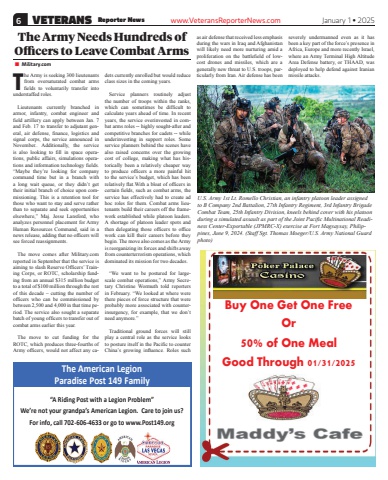 6 VETERANS Reporter News www.VeteransReporterNews.com January 1 %u2022 2025Buy One Get One FreeOr 50% of One Meal Good Through 01/31/2025 The American LegionParadise Post 149 Family%u201cA Riding Post with a Legion Problem%u201dWe%u2019re not your grandpa%u2019s American Legion. Care to join us?For info, call 702-606-4633 or go to www.Post149.orgThe Army Needs Hundreds of Offi cers to Leave Combat Arms%u25a0 Military.comThe Army is seeking 300 lieutenants from oversaturated combat arms fi elds to voluntarily transfer into understaffed roles.Lieutenants currently branched in armor, infantry, combat engineer and fi eld artillery can apply between Jan. 7 and Feb. 17 to transfer to adjutant general, air defense, fi nance, logistics and signal corps, the service announced in November.. Additionally, the service is also looking to fi ll in space operations, public affairs, simulations operations and information technology fi elds. %u201cMaybe they%u2019re looking for company command time but in a branch with a long wait queue, or they didn%u2019t get their initial branch of choice upon commissioning. This is a retention tool for those who want to stay and serve rather than to separate and seek opportunities elsewhere,%u201d Maj. Jesse Lansford, who analyzes personnel placement for Army Human Resources Command, said in a news release, adding that no offi cers will see forced reassignments.The move comes after Military.com reported in September that the service is aiming to slash Reserve Offi cers%u2019 Training Corps, or ROTC, scholarship funding from an annual $315 million budget to a total of $100 million through the rest of this decade %u2013 cutting the number of offi cers who can be commissioned by between 2,500 and 4,000 in that time period. The service also sought a separate batch of young offi cers to transfer out of combat arms earlier this year.The move to cut funding for the ROTC, which produces three-fourths of Army offi cers, would not affect any cadets currently enrolled but would reduce class sizes in the coming years.Service planners routinely adjust the number of troops within the ranks, which can sometimes be diffi cult to calculate years ahead of time. In recent years, the service overinvested in combat arms roles -- highly sought-after and competitive branches for cadets -- while underinvesting in support roles. Some service planners behind the scenes have also raised concerns over the growing cost of college, making what has historically been a relatively cheaper way to produce offi cers a more painful hit to the service%u2019s budget, which has been relatively fl at.With a bloat of offi cers in certain fi elds, such as combat arms, the service has effectively had to create ad hoc roles for them. Combat arms lieutenants build their careers off the framework established while platoon leaders. A shortage of platoon leader spots and then delegating those offi cers to offi ce work can kill their careers before they begin. The move also comes as the Army is reorganizing its forces and shifts away from counterterrorism operations, which dominated its mission for two decades.%u201cWe want to be postured for largescale combat operations,%u201d Army Secretary Christine Wormuth told reporters in February. %u201cWe looked at where were there pieces of force structure that were probably more associated with counterinsurgency, for example, that we don%u2019t need anymore.%u201dTraditional ground forces will still play a central role as the service looks to posture itself in the Pacifi c to counter China%u2019s growing infl uence. Roles such as air defense that received less emphasis during the wars in Iraq and Afghanistan will likely need more nurturing amid a proliferation on the battlefi eld of lowcost drones and missiles, which are a generally new threat to U.S. troops, particularly from Iran. Air defense has been severely undermanned even as it has been a key part of the force%u2019s presence in Africa, Europe and more recently Israel, where an Army Terminal High Altitude Area Defense battery, or THAAD, was deployed to help defend against Iranian missile attacks.U.S. Army 1st Lt. Romello Christian, an infantry platoon leader assigned to B Company 2nd Battalion, 27th Infantry Regiment, 3rd Infantry Brigade Combat Team, 25th Infantry Division, kneels behind cover with his platoon during a simulated assault as part of the Joint Pacifi c Multinational Readiness Center-Exportable (JPMRC-X) exercise at Fort Magsaysay, Philippines, June 9, 2024. (Staff Sgt. Thomas Moeger/U.S. Army National Guard photo)