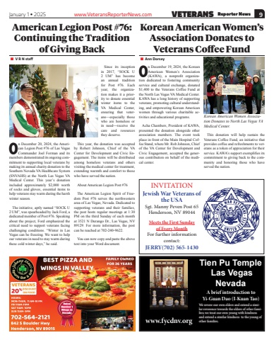 January 1 %u2022 2025 www.VeteransReporterNews.com VETERANS Reporter News 9www.fycdnv.orgTien Pu Temple Las VegasNevadaA brief introduction toYi-Guan Dao (I-Kuan Tao)We revere our own elders and extend a similar reverence towards the elders of other families; we treat our own young with kindness and extend a similar kindness to the young of other families. INVITATIONJewish War Veterans of the USASgt. Manny Peven Post 65Henderson, NV 89044Meets the First Sundayof Every MonthFor further information contact:JERRY(702) 565-1430Korean American Women%u2019s Association Donates to Veterans Coffee Fund%u25a0 Ann DorseyOn December 19, 2024, the Korean American Women%u2019s Association (KAWA), a nonprofit organization dedicated to fostering community service and cultural exchange, donated $1,400 to the Veterans Coffee Fund at the North Las Vegas VA Medical Center. KAWA has a long history of supporting veterans, promoting cultural understanding, and empowering Korean American women through various charitable activities and educational programs.Acha Chambers, President of KAWA, presented the donation alongside other association members. The event took place in front of the Main Hospital Coffee Stand, where Mr. Rob Johnson, Chief of the VA Center for Development and Civic Engagement, accepted the generous contribution on behalf of the medical center.This donation will help sustain the Veterans Coffee Fund, an initiative that provides coffee and refreshments to veterans as a token of appreciation for their service. KAWA%u2019s support exemplifies its commitment to giving back to the community and honoring those who have served the nation.Korean American Women Association Donates to North Las Vegas VA Medical Center.American Legion Post #76: Continuing the Tradition of Giving Back%u25a0 V R N staffOn December 20, 2024, the American Legion Post #76 of Las Vegas Commander Joel Forman and its members demonstrated its ongoing commitment to supporting local veterans by making its annual charity donation to the Southern Nevada VA Healthcare System (SNVAHS) at the North Las Vegas VA Medical Center. This year%u2019s donation included approximately $2,000 worth of socks and gloves, essential items to help veterans stay warm during the harsh winter season.The initiative, aptly named %u201cSOCK U 2 UM%u201d, was spearheaded by Jack Ford, a dedicated member of Post #76. Speaking about the project, Ford emphasized the critical need to support veterans facing challenging conditions. %u201cWinter in Las Vegas can be freezing. We want to help our veterans in need to stay warm during these cold winter days,%u201d he said.Since its inception in 2017, %u201cSOCK U 2 UM%u201d has become an annual tradition for Post #76. Each year, the organization makes it a priority to donate essential winter items to the VA Medical Center, ensuring that veterans%u2014especially those who are homeless or in need%u2014receive the care and resources they deserve.This year, the donation was accepted by Robert Johnson, Chief of the VA Center for Development and Civic Engagement. The items will be distributed among homeless veterans and others visiting the medical center for treatment, extending warmth and comfort to those who have served the nation.About American Legion Post #76The American Legion Spirit of Freedom Post #76 serves the northwestern area of Las Vegas, Nevada. Dedicated to supporting veterans and their families, the post hosts regular meetings at 1:30 PM on the third Sunday of each month at 3521 N Durango Dr., Las Vegas, NV 89129. For more information, the post can be reached at 702-240-9622.You can now copy and paste the above text into your Word document.
