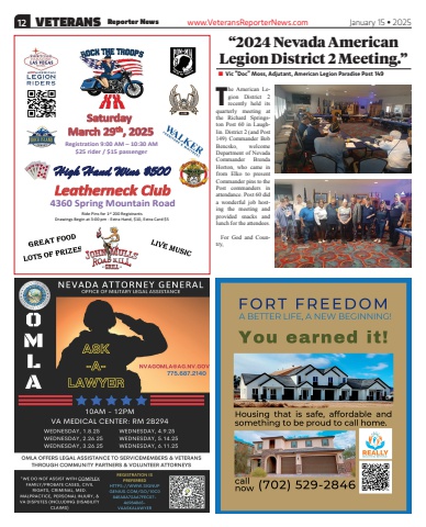 12 VETERANS Reporter News www.VeteransReporterNews.com January 15 %u2022 2025%u201c2024 Nevada American Legion District 2 Meeting.%u201d%u25a0 Vic %u201cDoc%u201d Moss, Adjutant, American Legion Paradise Post 149The American Legion District 2 recently held its quarterly meeting at the Richard Springston Post 60 in Laughlin. District 2 (and Post 149) Commander Bob Bencsko, welcome Department of Nevada Commander Brenda Horton, who came in from Elko to present Commander pins to the Post commanders in attendance. Post 60 did a wonderful job hosting the meeting and provided snacks and lunch for the attendees.For God and Country,Ride Pins for 1st 200 RegistrantsDrawings Begin at 3:00 pm - Extra Hand, $10, Extra Card $5High Hand Wins $500Registration 9:00 AM %u2013 10:30 AM$25 rider / $15 passenger4360 Spring Mountain Road