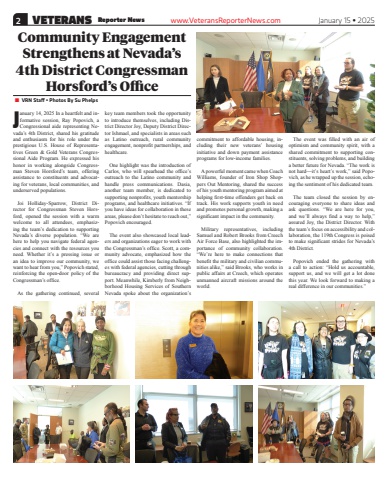 2 VETERANS Reporter News www.VeteransReporterNews.com January 15 %u2022 2025Community Engagement Strengthens at Nevada%u2019s 4th District Congressman Horsford%u2019s Office%u25a0 VRN Staff %u2022 Photos By Su PhelpsJanuary 14, 2025 In a heartfelt and informative session, Ray Popovich, a Congressional aide representing Nevada%u2019s 4th District, shared his gratitude and enthusiasm for his role under the prestigious U.S. House of Representatives Green & Gold Veterans Congressional Aide Program. He expressed his honor in working alongside Congressman Steven Horsford%u2019s team, offering assistance to constituents and advocating for veterans, local communities, and underserved populations.Joi Holliday-Sparrow, District Director for Congressman Steven Horsford, opened the session with a warm welcome to all attendees, emphasizing the team%u2019s dedication to supporting Nevada%u2019s diverse population. %u201cWe are here to help you navigate federal agencies and connect with the resources you need. Whether it%u2019s a pressing issue or an idea to improve our community, we want to hear from you,%u201d Popovich stated, reinforcing the open-door policy of the Congressman%u2019s office.As the gathering continued, several key team members took the opportunity to introduce themselves, including District Director Joy, Deputy District Director Ishmael, and specialists in areas such as Latino outreach, rural community engagement, nonprofit partnerships, and healthcare.One highlight was the introduction of Carlos, who will spearhead the office%u2019s outreach to the Latino community and handle press communications. Dasia, another team member, is dedicated to supporting nonprofits, youth mentorship programs, and healthcare initiatives. %u201cIf you have ideas for collaboration in these areas, please don%u2019t hesitate to reach out,%u201d Popovich encouraged.The event also showcased local leaders and organizations eager to work with the Congressman%u2019s office. Scott, a community advocate, emphasized how the office could assist those facing challenges with federal agencies, cutting through bureaucracy and providing direct support. Meanwhile, Kimberly from Neighborhood Housing Services of Southern Nevada spoke about the organization%u2019s commitment to affordable housing, including their new veterans%u2019 housing initiative and down payment assistance programs for low-income families.A powerful moment came when Coach Williams, founder of Iron Shop Shoppers Out Mentoring, shared the success of his youth mentoring program aimed at helping first-time offenders get back on track. His work supports youth in need and promotes personal growth, making a significant impact in the community.Military representatives, including Samuel and Robert Brooks from Creech Air Force Base, also highlighted the importance of community collaboration. %u201cWe%u2019re here to make connections that benefit the military and civilian communities alike,%u201d said Brooks, who works in public affairs at Creech, which operates unmanned aircraft missions around the world.The event was filled with an air of optimism and community spirit, with a shared commitment to supporting constituents, solving problems, and building a better future for Nevada. %u201cThe work is not hard%u2014it%u2019s heart%u2019s work,%u201d said Popovich, as he wrapped up the session, echoing the sentiment of his dedicated team.The team closed the session by encouraging everyone to share ideas and ask questions. %u201cWe are here for you, and we%u2019ll always find a way to help,%u201d assured Joy, the District Director. With the team%u2019s focus on accessibility and collaboration, the 119th Congress is poised to make significant strides for Nevada%u2019s 4th District.Popovich ended the gathering with a call to action: %u201cHold us accountable, support us, and we will get a lot done this year. We look forward to making a real difference in our communities.%u201d