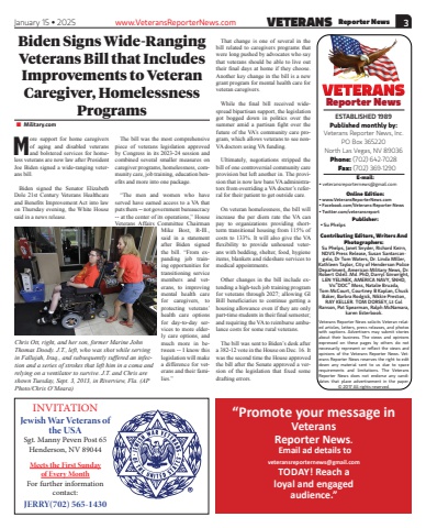 January 15 %u2022 2025 www.VeteransReporterNews.com VETERANS Reporter News 3VETERANSReporter NewsESTABLISHED 1989Published monthly by:Veterans Reporter News, Inc.PO Box 365220North Las Vegas, NV 89036Phone: (702) 642-7028 Fax: (702) 369-1290E-mail:%u2022 veteransreporternews@gmail.comOnline Edition:%u2022 www.VeteransReporterNews.com%u2022 Facebook.com/Veterans-Reporter-News%u2022 Twitter.com/veteransreportPublisher: %u2022 Su PhelpsVeterans Reporter News solicits Veteran related articles, letters, press releases, and photos with captions. Advertisers may submit stories about their business. The views and opinions expressed on these pages by others do not necessarily represent or reflect the views and opinions of the Veterans Reporter News. Veterans Reporter News reserves the right to edit down any material sent to us due to space requirements and limitations. The Veterans Reporter News does not endorse any candidates that place advertisement in the paper.%u00a9 2017 All rights reserved.Contributing Editors, Writers And Photographers:Su Phelps, Janet Snyder, Richard Keirn, NDVS Press Release, Susan Santarcangelo, Dr Tom Waters, Dr. Linda MIller, Kathleen Taylor, City of Henderson Police Department, American Military News, Dr. Robert Odell .Md. PhD, Darryl Ginwright, LEN YELINEK, AMERICA NAVY, SNHD, Vic%u201dDOC%u201d Moss, Natalie Bruzda,Tom McCourt, Courtney B Kaplan, Chuck Baker, Barbra Rodgick, Nikkie Preston, RAY KELLER. TOM DORSEY, Lt Col Ranson, Pat Spearman, Ralph McNamara, karen Esterbook.Biden Signs Wide-Ranging Veterans Bill that Includes Improvements to Veteran Caregiver, Homelessness Programs%u25a0 Military.comMore support for home caregivers of aging and disabled veterans and bolstered services for homeless veterans are now law after President Joe Biden signed a wide-ranging veterans bill.Biden signed the Senator Elizabeth Dole 21st Century Veterans Healthcare and Benefits Improvement Act into law on Thursday evening, the White House said in a news release.The bill was the most comprehensive piece of veterans legislation approved by Congress in its 2023-24 session and combined several smaller measures on caregiver programs, homelessness, community care, job training, education benefits and more into one package.%u201cThe men and women who have served have earned access to a VA that puts them -- not government bureaucracy -- at the center of its operations,%u201d House Veterans Affairs Committee Chairman Mike Bost, R-Ill., said in a statement after Biden signed the bill. %u201cFrom expanding job training opportunities for transitioning service members and veterans, to improving mental health care for caregivers, to protecting veterans%u2019 health care options for day-to-day services to more elderly care options, and much more in between -- I know this legislation will make a difference for veterans and their families.%u201dThat change is one of several in the bill related to caregivers programs that were long pushed by advocates who say that veterans should be able to live out their final days at home if they choose. Another key change in the bill is a new grant program for mental health care for veteran caregivers.While the final bill received widespread bipartisan support, the legislation got bogged down in politics over the summer amid a partisan fight over the future of the VA%u2019s community care program, which allows veterans to see nonVA doctors using VA funding.Ultimately, negotiations stripped the bill of one controversial community care provision but left another in. The provision that is now law bans VA administrators from overriding a VA doctor%u2019s referral for their patient to get outside care.On veteran homelessness, the bill will increase the per diem rate the VA can pay to organizations providing shortterm transitional housing from 115% of costs to 133%. It will also give the VA flexibility to provide unhoused veterans with bedding, shelter, food, hygiene items, blankets and rideshare services to medical appointments.Other changes in the bill include extending a high-tech job training program for veterans through 2027; allowing GI Bill beneficiaries to continue getting a housing allowance even if they are only part-time students in their final semester; and requiring the VA to reimburse ambulance costs for some rural veterans.The bill was sent to Biden%u2019s desk after a 382-12 vote in the House on Dec. 16. It was the second time the House approved the bill after the Senate approved a version of the legislation that fixed some drafting errors.Chris Ott, right, and her son, former Marine John Thomas Doody. J.T., left, who was shot while serving in Fallujah, Iraq., and subsequently suffered an infection and a series of strokes that left him in a coma and relying on a ventilator to survive. J.T. and Chris are shown Tuesday, Sept. 3, 2013, in Riverview, Fla. (AP Photo/Chris O%u2019Meara)INVITATIONJewish War Veterans of the USASgt. Manny Peven Post 65Henderson, NV 89044Meets the First Sundayof Every MonthFor further information contact:JERRY(702) 565-1430%u201cPromote your message in VeteransReporter News. Email ad details toveteransreporternews@gmail.comTODAY! Reach a loyal and engaged audience.%u201d