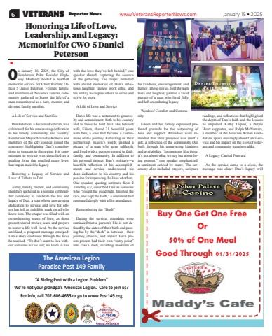 6 VETERANS Reporter News www.VeteransReporterNews.com January 15 %u2022 2025Honoring a Life of Love, Leadership, and Legacy: Memorial for CWO-5 Daniel Peterson%u25a0On January 16, 2025, the City of Henderson Palm Boulder Highway Mortuary hosted a heartfelt memorial service for Chief Warrant Offi cer 5 Daniel Peterson. Friends, family, and members of Nevada%u2019s veteran community gathered to honor the life of a man remembered as a hero, mentor, and devoted family member.A Life of Service and Sacrifi ceDan Peterson, a decorated veteran, was celebrated for his unwavering dedication to his family, community, and country. Henderson Mayor Michelle Romero and members of the city council joined the ceremony, highlighting Dan%u2019s contributions to veterans in the region. His commitment to service was described as a guiding force that touched many lives, leaving an indelible legacy.Honoring a Legacy of Service and Love: A Tribute to DanToday, family, friends, and community members gathered in a solemn yet heartfelt ceremony to celebrate the life and legacy of Dan, a man whose unwavering dedication to service and love for others has left an indelible mark on all who knew him. The chapel was fi lled with an overwhelming sense of love, as those present shared stories, tears, and prayers to honor a life well-lived. As the service unfolded, a poignant message emerged: Dan%u2019s story continues through the lives he touched. %u201cWe don%u2019t learn to live without someone we%u2019ve lost; we learn to live with the love they%u2019ve left behind,%u201d one speaker shared, capturing the essence of the gathering. The chapel brimmed with shared memories of Dan%u2019s infectious laughter, tireless work ethic, and his ability to inspire others to serve and strive for more.A Life of Love and ServiceDan%u2019s life was a testament to generosity and commitment, both to his country and to those he held dear. His beloved wife, Eileen, shared 31 beautiful years with him, a love that became a cornerstone of his journey. Refl ecting on their partnership, Eileen%u2019s words painted a picture of a man who gave selfl essly and lived with a purpose rooted in faith, family, and community. In addition to his personal impact, Dan%u2019s obituary%u2014a heartfelt refl ection of his accomplishments and service%u2014underscored his deep dedication to his country and his passion for improving the lives of others. One speaker, quoting scripture from 2 Timothy 4:7, described Dan as someone who %u201cfought the good fi ght, fi nished the race, and kept the faith,%u201d a sentiment that resonated deeply with all in attendance.Remembering the %u201cDash%u201dDuring the service, attendees were reminded that a person%u2019s life is not defi ned by the dates of their birth and passing but by the %u201cdash%u201d in between%u2014their journey, choices, and impact. Each person present had their own %u201centry point%u201d into Dan%u2019s dash, recalling moments of his kindness, encouragement, and humor. These stories, told through tears and laughter, painted a vivid picture of a man who lived fully and left an enduring legacy.Words of Comfort and CommunityEileen and her family expressed profound gratitude for the outpouring of love and support. Attendees were reminded that their presence was itself a gift, a refl ection of the community Dan built through his unwavering kindness and availability. %u201cIn moments like these, it%u2019s not about what we say but about being present,%u201d one speaker emphasized, a sentiment echoed by many. The ceremony also included prayers, scripture readings, and refl ections that highlighted the depth of Dan%u2019s faith and the lessons he imparted. Kathy Lupias, a Purple Heart supporter, and Ralph McNamara, a member of the Veterans Action Foundation, spoke movingly about Dan%u2019s service and his impact on the lives of veterans and community members alike.A Legacy Carried ForwardAs the service came to a close, the message was clear: Dan%u2019s legacy will Buy One Get One FreeOr 50% of One Meal Good Through 01/31/2025 The American LegionParadise Post 149 Family%u201cA Riding Post with a Legion Problem%u201dWe%u2019re not your grandpa%u2019s American Legion. Care to join us?For info, call 702-606-4633 or go to www.Post149.org